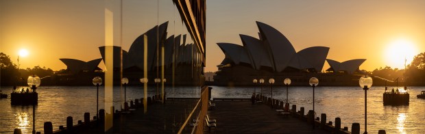 A 4-shot pano of Sydney Opera House just after sunrise reflected in the windows of the Park Hyatt.