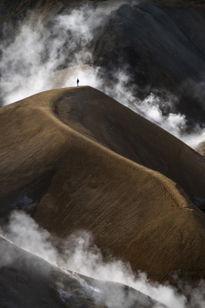A lone hiker is captured as he pauses on a rhyolite ridgeline in the central highlands at Kerlingarfjöll in Iceland.