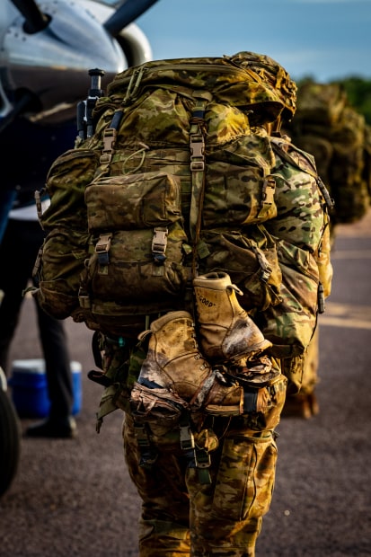 After days of patrolling through crocodile filled swamps, a local soldiers carries his pack towards a plane for a dawn flight home. Taped and repairer boots tell of the miles walked to protect local fisheries and the Top End’s fragile ecosystem, the words speak of the humour of Soldiers.