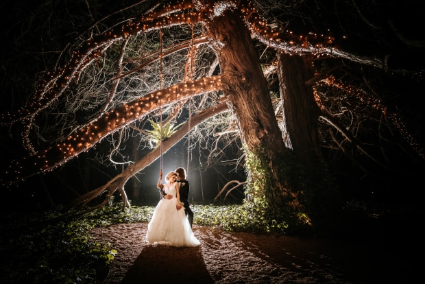 Aptly named the 'Magic Faraway Tree', a 130 year old cypress tree is the perfect place to escape the busy evening reception for a quiet moment together. 2 flash combination, one on camera and one behind to create the halo and extra lighting of the magical tree.