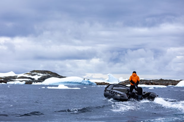 Taken in the icy waters of Antarctica, the lone navigator steers a zodiac into the silent expanse, heading deeper into the frozen wilderness.