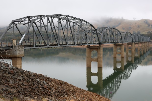 A cold winter morning with mist starting to rise, A quiet steel bridge stands alone in the middle of calm waters.