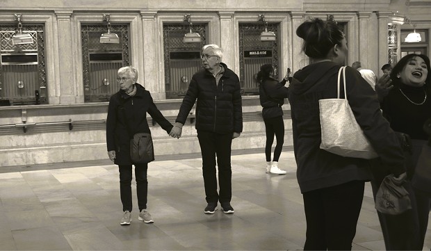 A couple awaits the return of their son at Grand Central station