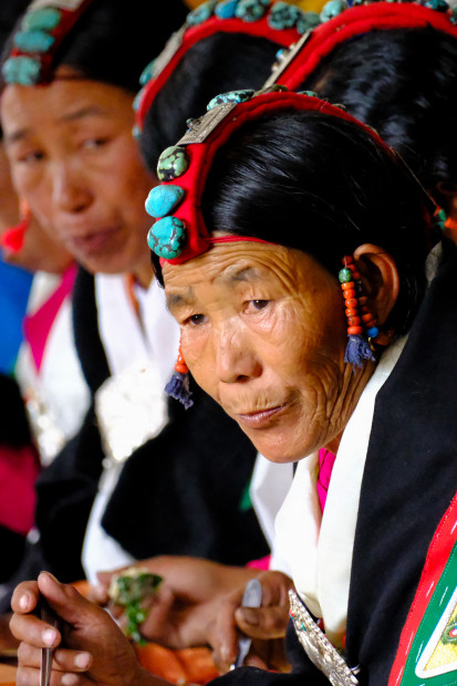 A Lhoba woman wears the traditional headdress for the Yartung Festival at Kimaling in Upper Mustang. Precious Tibetan turquoise dominates with the earrings having six small read ornate stones threaded together in a drop. The whole village attends the festival. A sit down lunch is the beginning and I was lucky to one of the first foreigners ever invited to watch. It was a great honor and our hosts were the most generous people you could met.