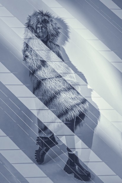 He leans—slanted, composed—against a bare wall, cloaked in a textured robe that drapes to his knees, with the hood framing his presence. Heavy boots root him to the ground and his face turns toward the light, with quiet conviction. The patterns on the image like when seen through a glass door, obscuring and revealing in the same breath.