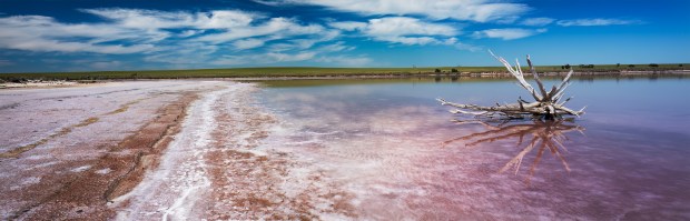 Unearthed captures the weathered remains of a dead tree rising from the pink waters of a salt lake, its branches stretching outward like veins across the surface. The lake’s vivid hues reflect the stump in perfect symmetry, framed by salt crystals gathering along the shoreline. In the distance, rolling green hills and wisps of cirrus clouds offer a soft contrast to the raw textures below. This moment reveals something both ancient and otherworldly — a trace of what once lived, now etched into the colours of the land, salt, and sky. Panorama using tilt shift lens - 3 photos stitched.