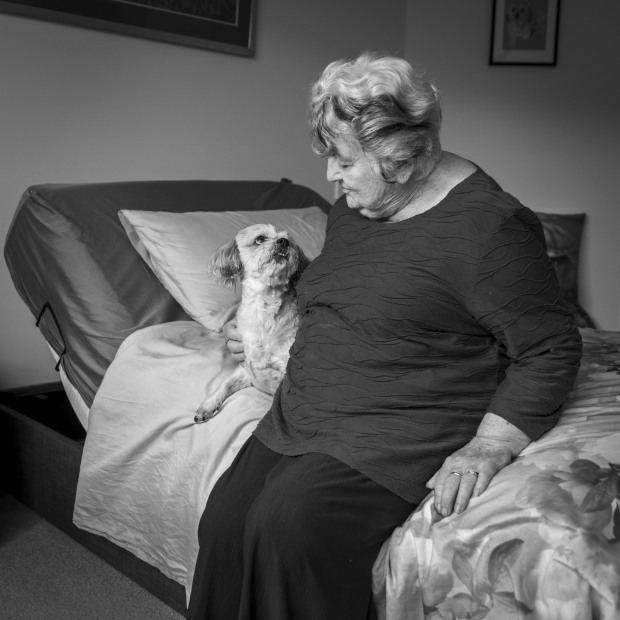 For many older people, pets provide comfort, companionship, and routine. This portrait reflects the quiet connection between a woman and her dog, showing the importance of animals in later life.