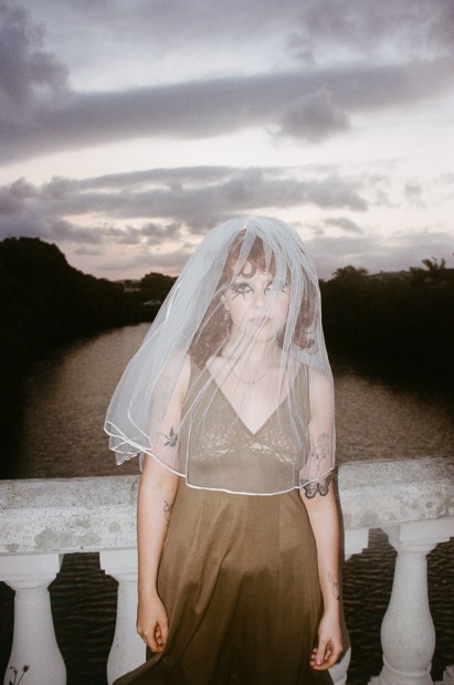 Taken in the spring of 2023, by the Brisbane River. Using a Nikon F50 and Kodak 300 film, Lina (peachylina) is pictured wearing a veil in the breeze.