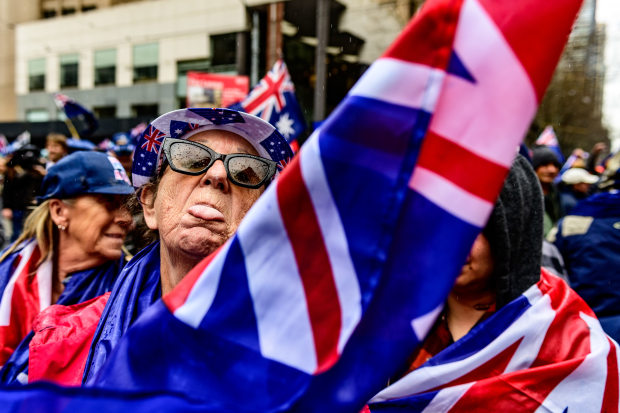 In the Melbourne rain a woman draped in Australian flags at the “March for Australia” pokes her tongue at the camera during a right-wing, anti-immigration rally. She reflects the mood on the street, hostile and aggressive. Protesters claimed to respect the flag, and wore it as hats and capes while shouting at and abusing passers-by and counter-protesters.