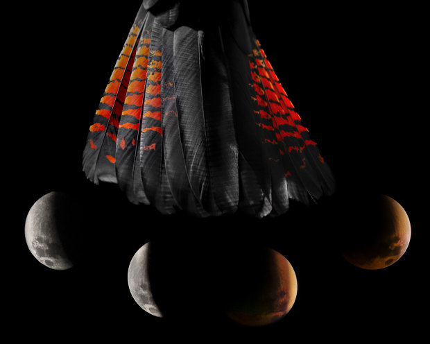 Pilbara earth inspires this piece – a region of Australia’s outback defined by its ancient geology, vast plains, and painterly iron-red landscape. Veiled in crushed blacks, maroon, and golden tones drawn from the iconic glossy black cockatoo feathers (Pirtirra) and the rare lunar eclipse, each element echoes the burnt landscape and the Australian Aboriginal Flag. The Pilbara-based Jiwarli title is pronounced wheh-lehr-lrah gahr-lah and translates to “Fire Moon.” The hundreds of Indigenous Australian languages like Jiwarli are now rare spoken, risking Australia the loss of extensive cultural knowledge embedded within them – knowledge accumulated over perhaps more than 15,000 fire moons.